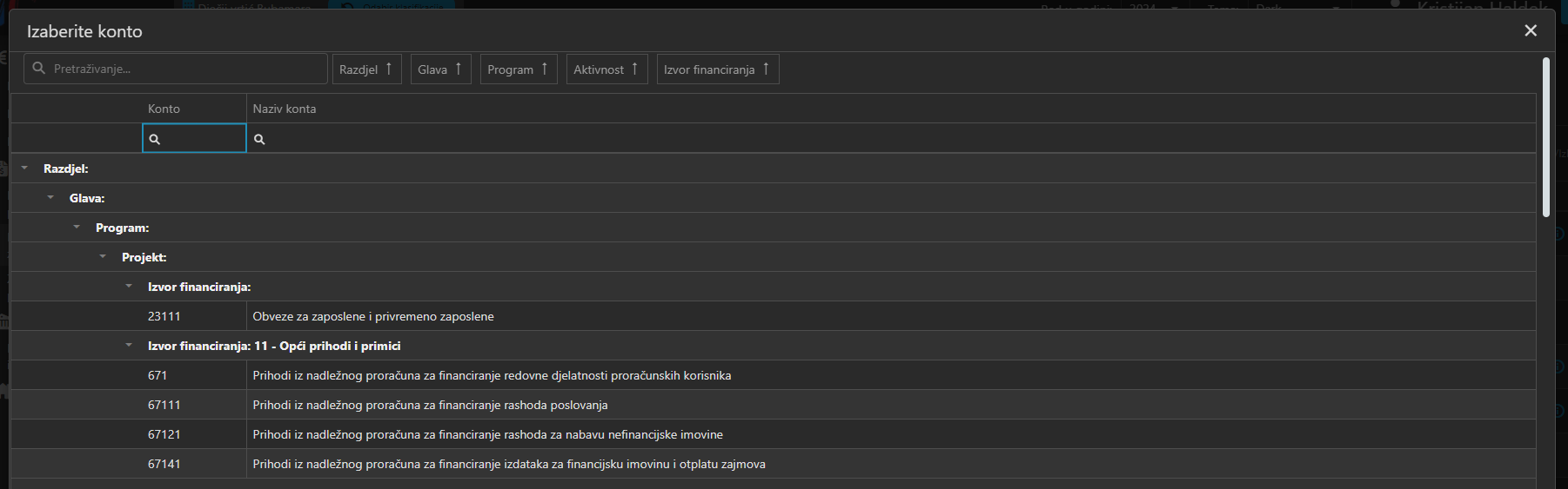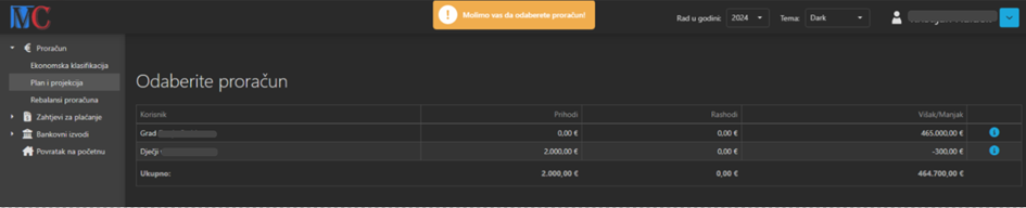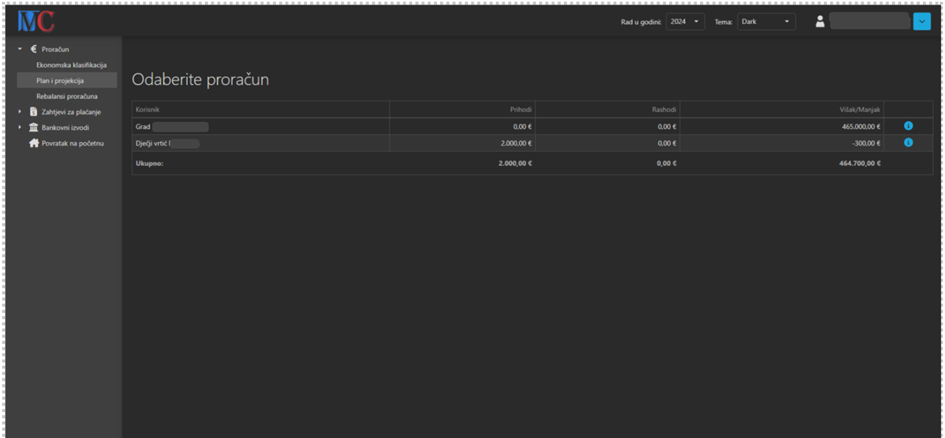 Sa lijeve strane ekrana nalazi se prikaz odabranog plana proračuna. U slučaju da postoji samo jedan proračun tada se prikazuje samo naziv tog proračuna, a ako ih postoji više prikazuje se padajući izbornik za odabir željenog plana.