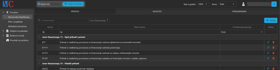 Ekonomska klasifikacija sastoji se od 3 dijela: Prihodi, Rashodi i Višak/manjak. Svaki segment ima opciju dodavanja novog unosa u desnom kutu iznad tablice na gumbu: „Dodaj“. Spomenuta opcija omogućena je za glavnog korisnika kao i za proračunske korisnike s odgovarajućim ovlastima. Klikom na opciju: „Uredi“ ili „Dodaj“ , koja se nalazi u zadnjem desnom stupcu izbornika, otvara se prozor koji omogućuje uređivanje, a crvena “kanta za smeće” omogućuje brisanje unesenih podataka.