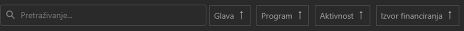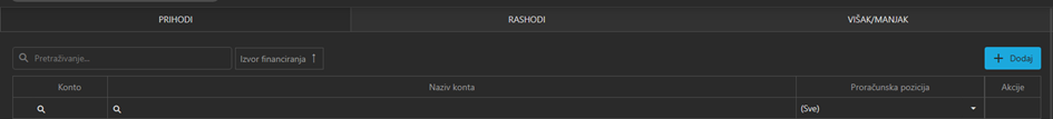 Svaka tablica u aplikaciji sadrži opcije za pretragu unesenih podataka na vrhu tablice i na vrhu svakog stupca u tablici.