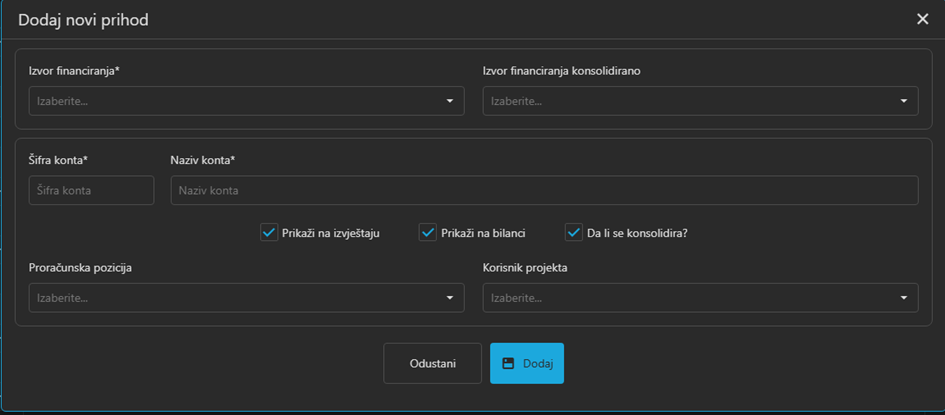 Za dodavanje i uređivanje prihoda potrebno je ispuniti polja koja sadrže znak: „*“ . Ta polja su obavezna i ukoliko ista nisu popunjena zapis ne ne može spremiti.
