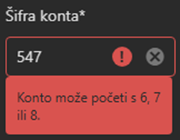 Za unos konta potrebno je u polje: „šifra konta“ unijeti konto koji počinje sa znamenkama: 6, 7 ili 8. Nakon unosa cijelog konta omogućeno je dohvaćanje naziva konta pritiskom na tipku: „enter“ ili klikom izvan polja. U slučaju potrebe naknadno je moguće izmijeniti naziv konta kao i ostale pridodane podatke.