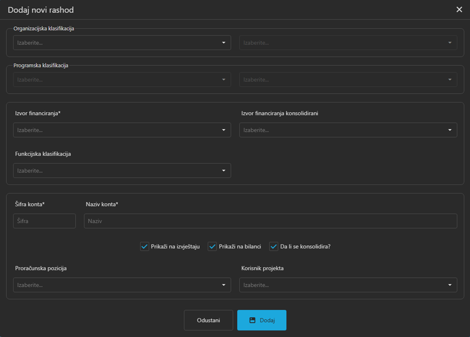Za dodavanje i uređivanje rashoda potrebno je slijediti identične korake kao i kod prihoda. Prozor za unos rashoda znatno je opširniji od prozora za unos prihoda. Za unos/uređivanje rashoda potrebno je unijeti polja: razdjel, glava, program i aktivnost na vrhu prozora. Ta polja međusobno su ovisna jedna o drugom pa tako nije moguće unijeti: „Glavu“ prije nego li se odabere: „Organizacijska klasifikacija“. Nakon odabira organizacijske klasifikacije dohvaćaju se i podaci za polje: „Programska klasifikacija“. Nakon odabira programa dohvaća se aktivnosti u polju kraj programske klasifikacije.