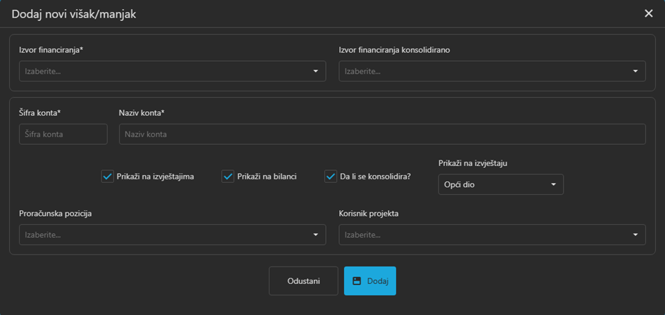 Dodavanje i uređivanje viška i manjka služi za unos viška ili manjka. Sam unos sličan je unosu konta prihoda. Dodatna opcija je „Prikaži na izvještaju“ kojom se definira prikaz na općem ili posebnom djelu izvještaja. U slučaju da se odabere opcija Opći dio, a korisnik ima Višak prihoda, upisani iznos bude vidljiv na izvještaju Račun prihoda, u slučaju da je manjak isti bude vidljiv na Računu rashoda.