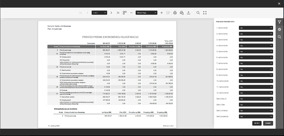 U segmentu: „Plan i projekcija“, kao i u sljedećem segmentu: „Rebalansi proračuna“ nalaze se izvještaji. Oni su vidljivi u desnom gornjem kutu ekrana iznad tablice i „tabova“.