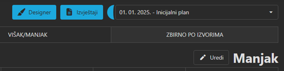 Uređivanje podataka je identično i na ostalim segmentima plana i projekcije. Na segmentu: „Višak/manjak“ postoji mogućnost odabira tipa podataka kao višak ili manjak. To je moguće samo ako postoji više planova proračuna i nije moguće na inicijalnom planu.