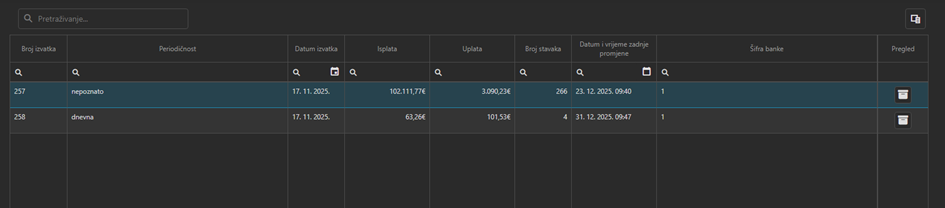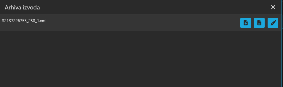 Bankovni izvodi sadrže tablicu bankovnih izvoda kod kojih je za svaki izvod moguće vidjeti arhivu izvoda i preuzeti xml datoteku u novom prozoru, kao i vidjeti izvještaj izvoda.