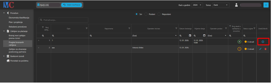 - Ikona "kante za smeće" služi za brisanje zahtjeva