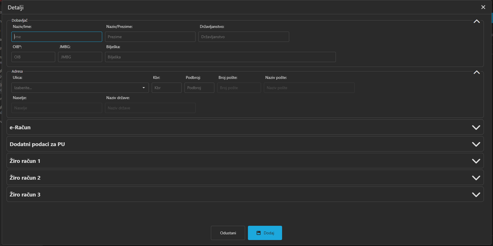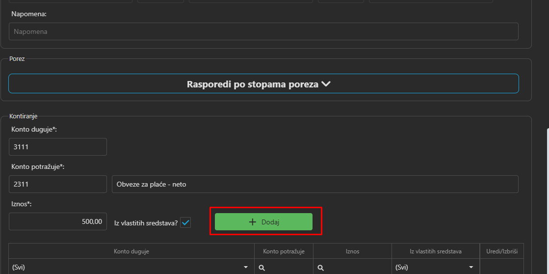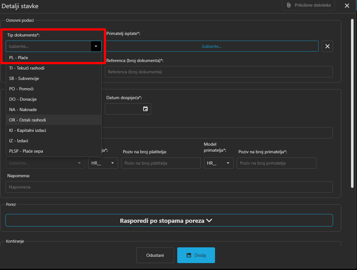 Kod klika za dodavanje ili uređivanje stavke otvara se novi prozor. Podijeljen je u 4 sekcije: „Osnovni podaci“, „Plaćanje“, „Porez“ i „Kontiranje“.