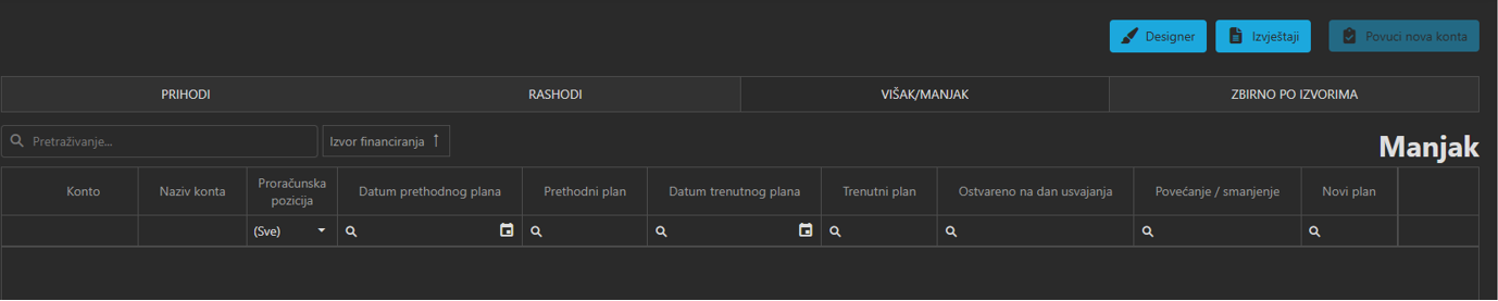 U slučaju da postoji više nacrta rebalansa u desnom kutu nalazi se padajući izbornik za odabir željenog plana. Desno od izbornika nalazi se gumb: „Povuci nova konta“ koji je onemogućen glavnom korisniku ili ako je nacrt proknjižen. Također samo korisnik sa: „full“ ovlastima ga može koristiti.