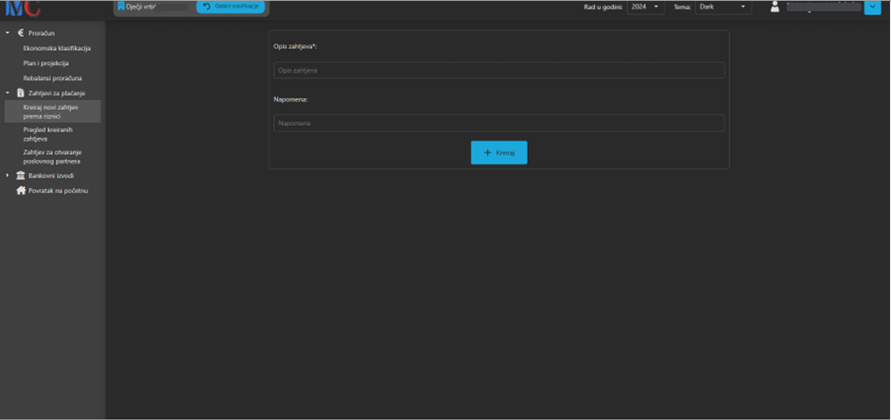 Za kreiranje zaglavlja zahtjeva potrebno je unijeti: Opis i napomenu. Opis je obavezno polje dok napomena nije. Klikom na gumb: „Kreiraj“ stvara se uneseno zaglavlje i otvara se njegov pregled u novom prozoru.