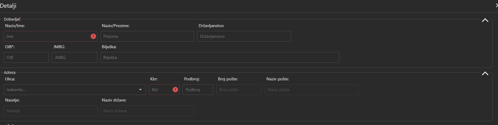 Obavijest koja je prikazana na slici ispod označava da je neko polje neispravno popunjeno, sadrži nepodržane vrijednosti ili je prazno. U tom slučaju program ne dozvoli spremanje do trenutka kada nisu svi obavezni podaci ispravno upisani.
