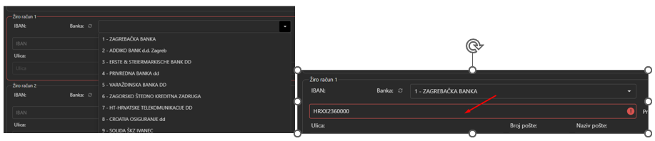 Prilikom unosa žiro računa, iz pripadajućeg izbornika odabire se banka i na temelju tog podatka program upisuje vodeći broj banke. U sljedeće polje upisuju se ostale znamenke i program sam kreira IBAN