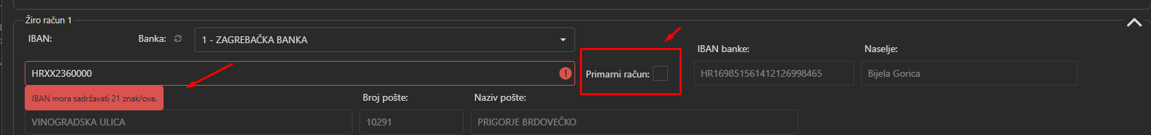 U slučaju da je neki od podataka neispravno unesen javlja se greška i zapis se neće spremiti. Obzirom da dobavljač može imati više žiro računa potrebno je odabrati primarni da prilikom plaćanja isti bude ponuđen automatski.