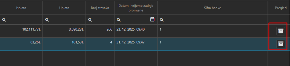 Nakon spremanja stavke s pripadajućom datotekom, kod sljedećeg otvaranja se na vrhu prozora nalazi gumb: „Pregledaj SEPA datoteku“ koji otvara tablicu sa sadržajem SEPA datoteke i mogućnošću brisanja iste. Uz taj gumb nalazi se i gumb: „Priložene datoteke“ koji sadrži popis datoteka.