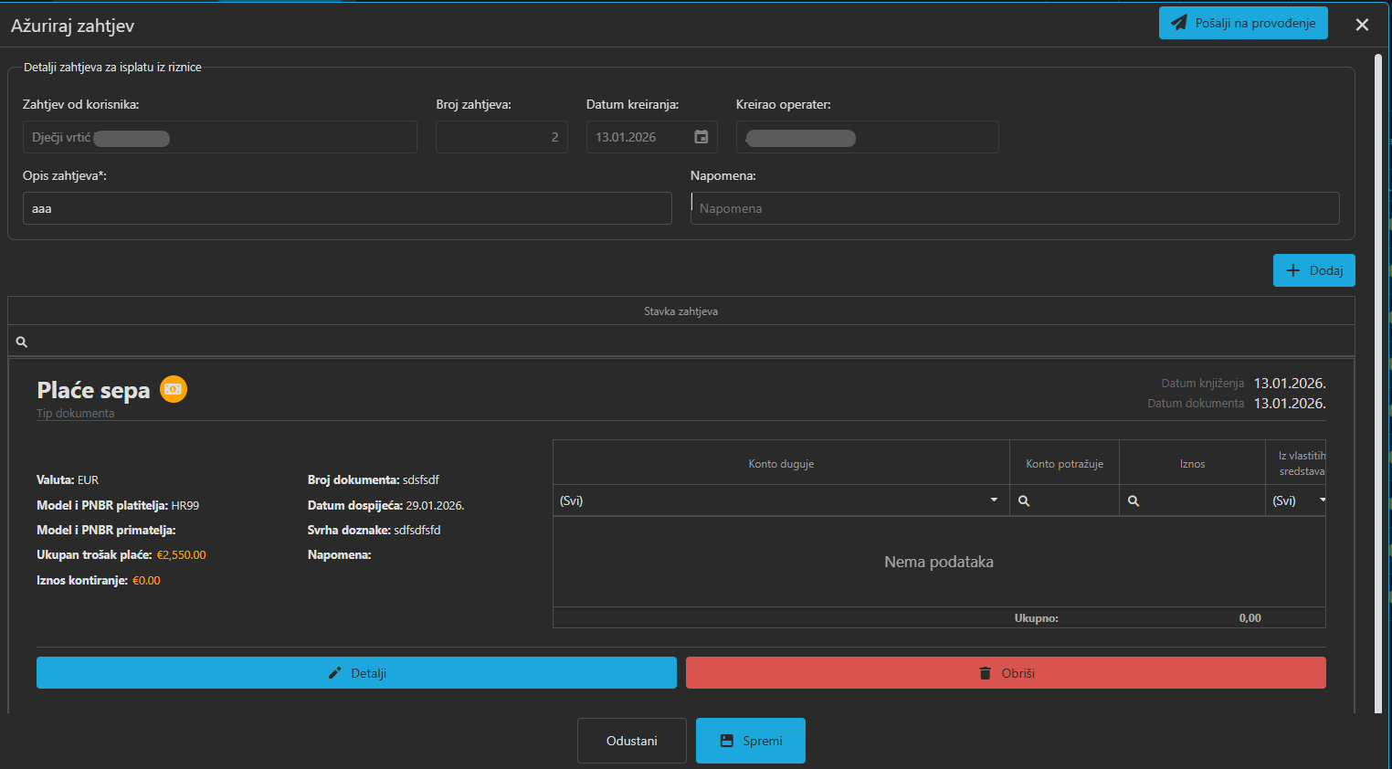 Detalji o zahtjevu sadrže podatke koje nije moguće mijenjati poput naziv proračunskog korisnika koji je kreirao zahtjev, broj zahtjeva, datum kreiranja i operatera koji je kreirao. Uz njih nalaze se i opis zahtjeva i napomena koju je moguće promijeniti.