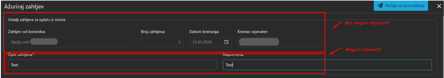 Nakon što je poslan na provođenje javi se obavijest da je Poslano na provođenje, datum te operater koji je zahtjev poslao na provođenje. Nakon toga podatke na zahtjevu više nije moguće uređivati.