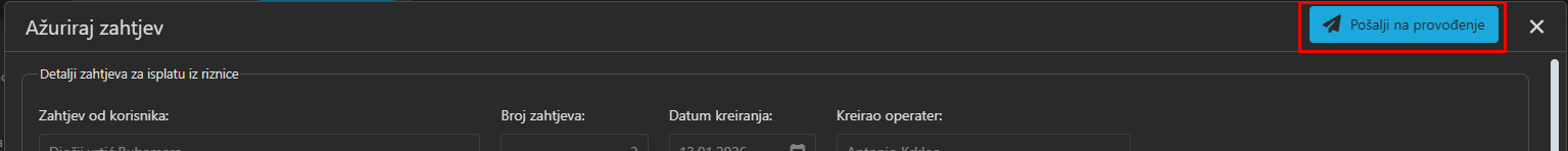 Na vrhu prozora uz gumb za zatvaranje nalazi se i gumb: "Pošalji na provođenje". Klikom na njega zahtjev se šalje na provođenje i daljnje uređivanje nije moguće.