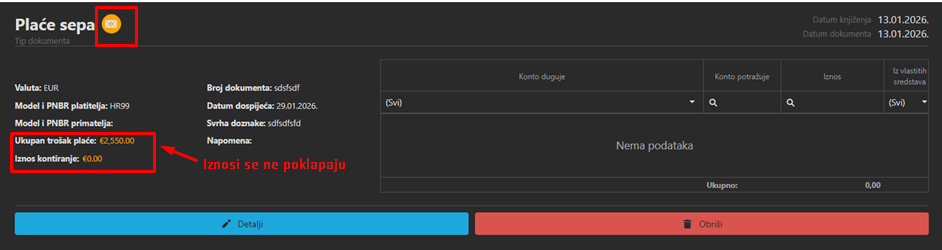 - Stavka zahtjeva za plaćanje - Iznosi se ne poklapaju