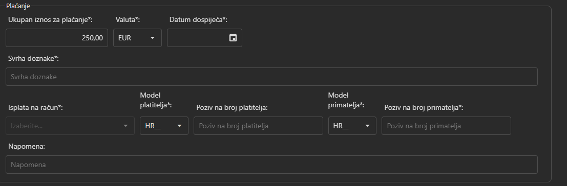 U sekciji: „Plaćanje“ unose se podaci koji su prikazani na slici ispod. „Ukupan iznos za plaćanje“ (ili „Ukupan trošak plaće“ ako je odabrani tip dokumenta: „Plaće sepa“).