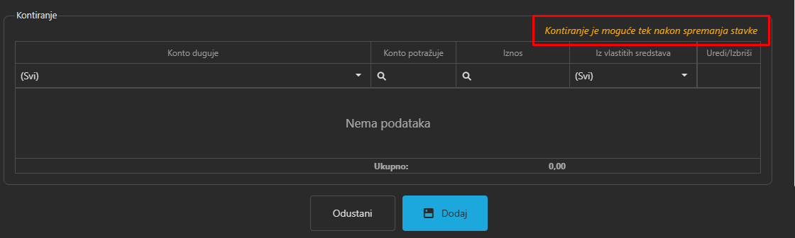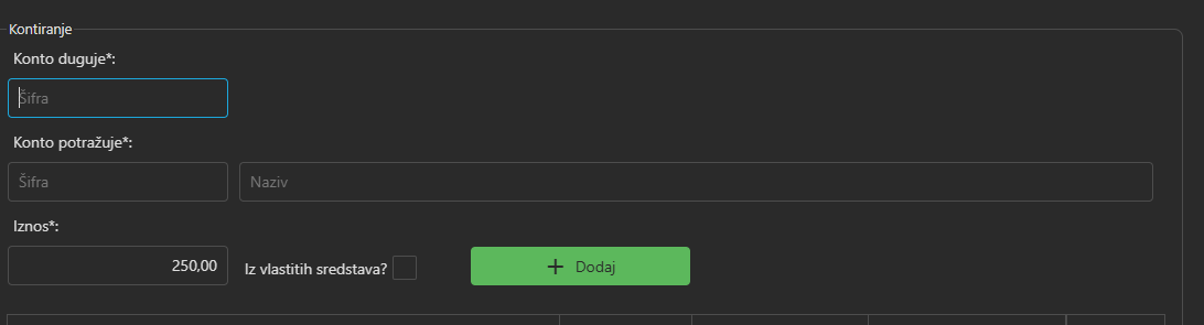 U slučaju da nam je potreban konto koji je prethodno unesen kliknemo na njega i odaberemo ga, a ako nije unesen nadležni proračun ga treba unijeti. U polje Iznos unosimo iznos koji želimo kontirati. Opcija Iz vlastitih sredstva označuje ako se iznos naznačuje iz vlastitih sredstva ili sredstva nadležnog proračuna.