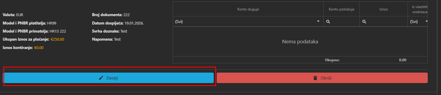 Nakon što se spremi stavka, da bi se ista kontirala potrebno je kliknuti na opciju Detalji.