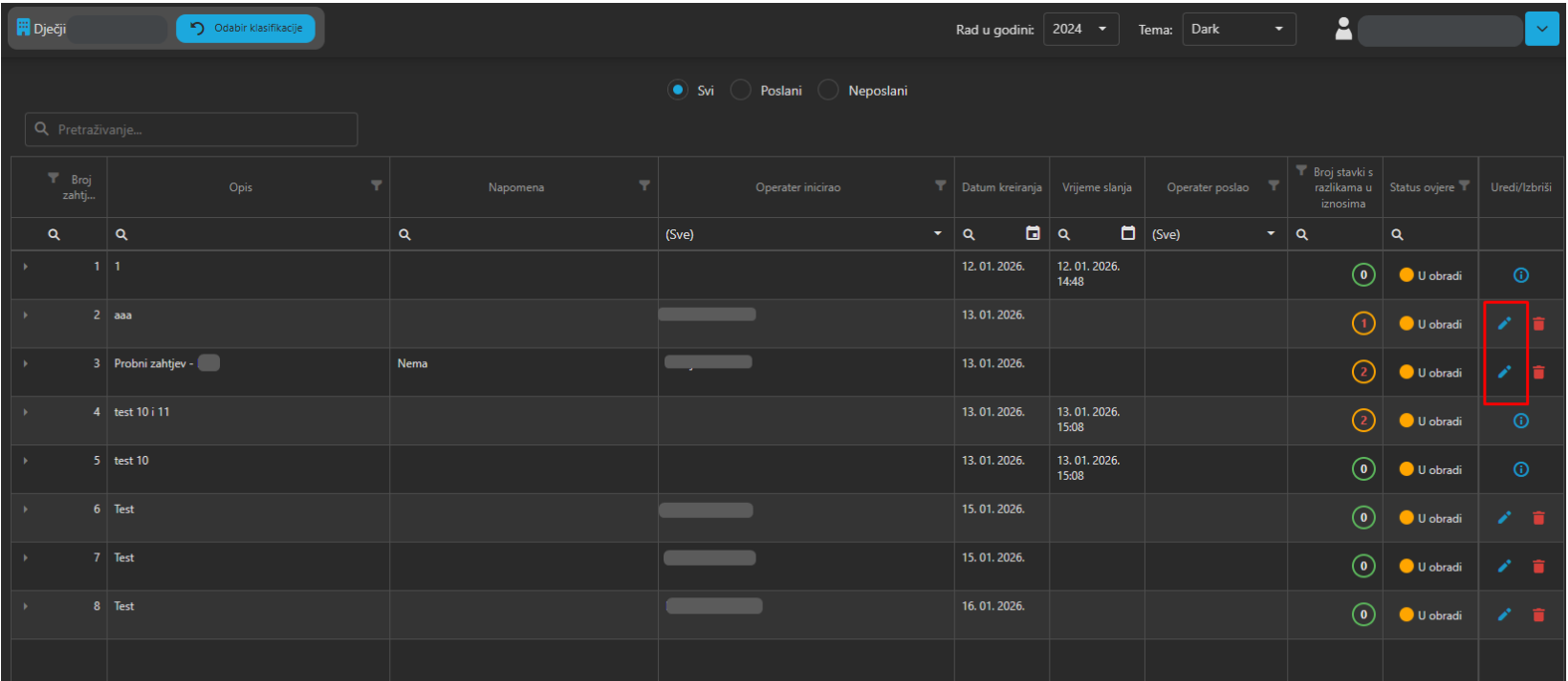 - Stupac Uredi / Izbriši koji se prikazuje u obliku olovke ili u obliku slova: „i“ .služi za uređivanje zahtjeva.